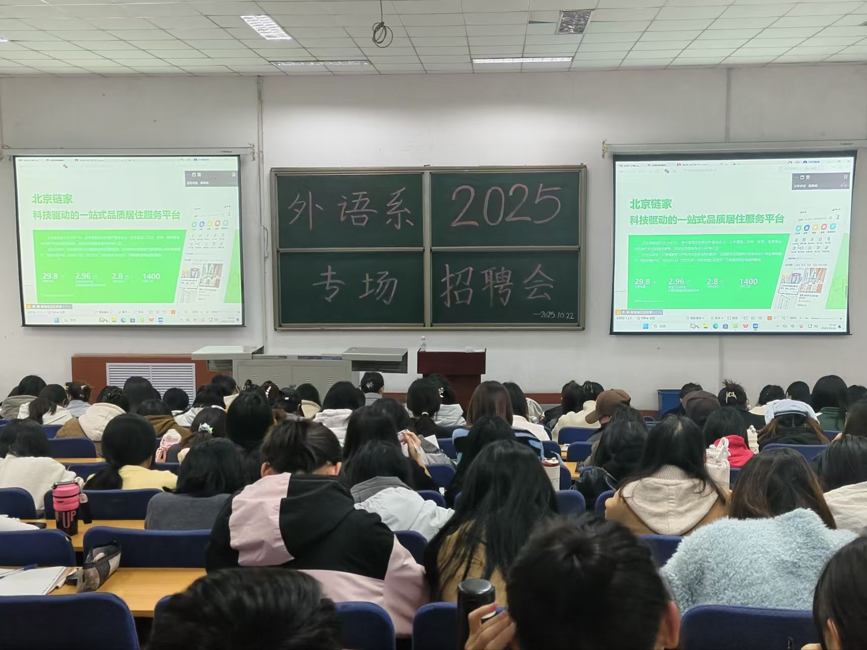 招聘会伊始,北京链家校招负责人高珮瑜以互动问答开场,为答题正确的学生赠送礼品,在趣味互动中帮助师生初步了解企业业务。随后,她围绕“链家是谁、岗位介绍、沃土计划、加入我们”四大板块展开讲解:北京链家成立于2001年,深耕行业24年,定位“科技驱动的一站式品质居住服务平台”,业务涵盖二手房、新房、租房等领域;目前北京区域拥有近1400家门店、超2.8万名活跃经纪人,累计达成交易29.8万单,依托“一体三翼”战略与“线上+线下”双核驱动模式,运用VR看房、AI算法等技术推进行业数字化转型。针对毕业生关切的岗位与培养体系,高珮瑜重点推介“沃土计划”,该项目采用多重融合培养模式,以系统课程结合十余项实战任务,覆盖AI工具、新媒体运营等前沿技能;薪酬福利方面,企业提供底薪、健康、休假三重保障,同步搭建清晰职业成长路径与高绩效提成机制。会议尾声,高珮瑜向学生发出入职邀约,并现场耐心解答毕业生关于面试流程、岗位适配性等疑问,活动氛围热烈,学生积极参加问答。