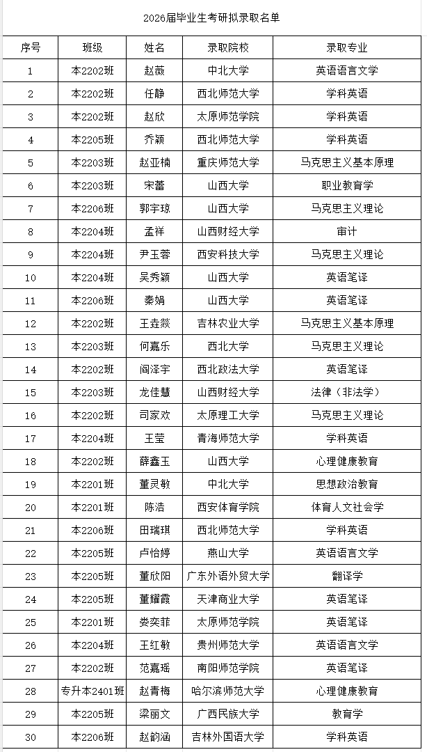 近日,外语系2026届毕业生考研工作传来捷报。据统计,截至目前,我系2026届共有231名毕业生,已有30人成功“上岸”,考研录取率达到12.99%。与2025届毕业生7.1%的考研录取率相比,本届考研升学成效实现了大幅提升,考研率接近翻番,充分展现了外语系学子扎实的专业基础和昂扬向上的精神风貌。